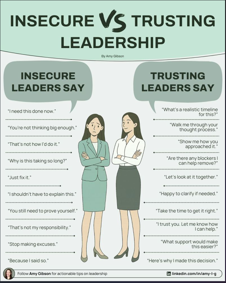 Insecure vs. Trusting Leadership – Image Source: Linkedin Original Post: Amy Gibson, CEO, C-Serve